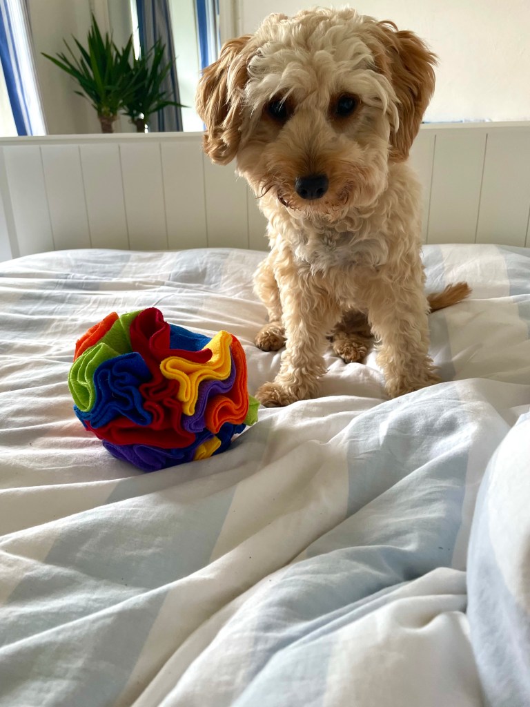 I love that word ‘enrichment’. It’s so important for our dogs so I’m always on the hunt for new toys and games that Amber and the other dogs I take care of can play with. Our new favourite is the rainbow-coloured snuffle ball.